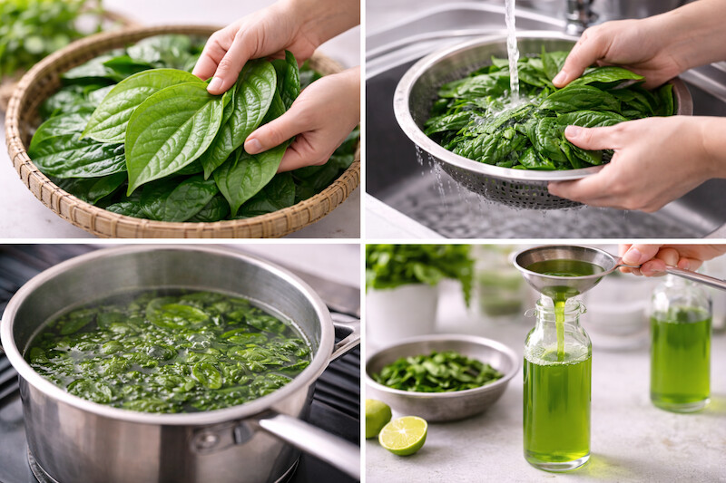 - Đun lá với nước sạch ở lửa nhỏ trong thời gian ngắn, tránh đun sôi kéo dài